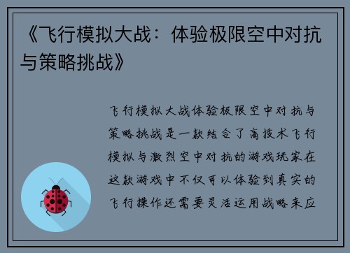 《飞行模拟大战:体验极限空中对抗与策略挑战》是一款结合了高技术飞行模拟与激烈空中对抗的游戏。玩家在这款游戏中不仅可以体验到真实的飞行操作,还需要灵活运用战略来应对各种复杂的空中战斗情境。本文将从四个方面详细介绍《飞行模拟大战》的独特魅力,包括飞行技术的挑战、空中战斗策略、游戏的沉浸感以及多人合作模式。通过这些方面的分析,我们将深入了解这款游戏如何让玩家在虚拟空中舞台上尽情体验极限空中对抗和策略挑战。
